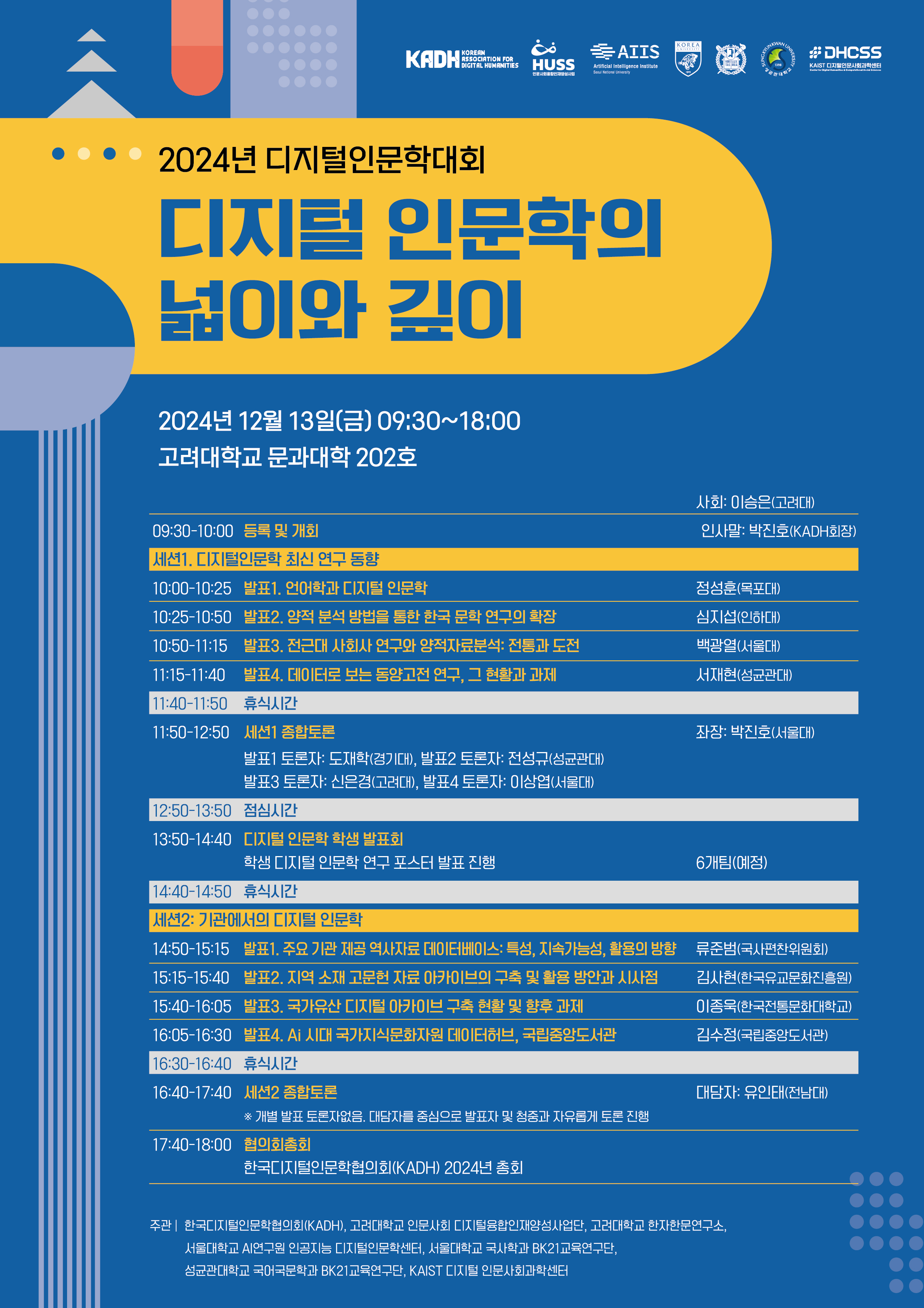 ■ 주관: 한국디지털인문학협의회(KADH), 고려대학교 인문사회 디지털융합인재양성사업단, 고려대학교 한자한문연구소, 서울대학교 AI연구원 인공지능 디지털인문학센터, 서울대학교 국사학과 BK21교육연구단, 성균관대학교 국어국문학과 BK21교육연구단, KAIST 디지털인문사회과학센터